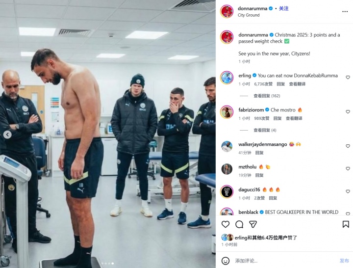 多纳鲁马晒赤裸上身称体重照,哈兰德:现在可以开吃啦,烤肉鲁马