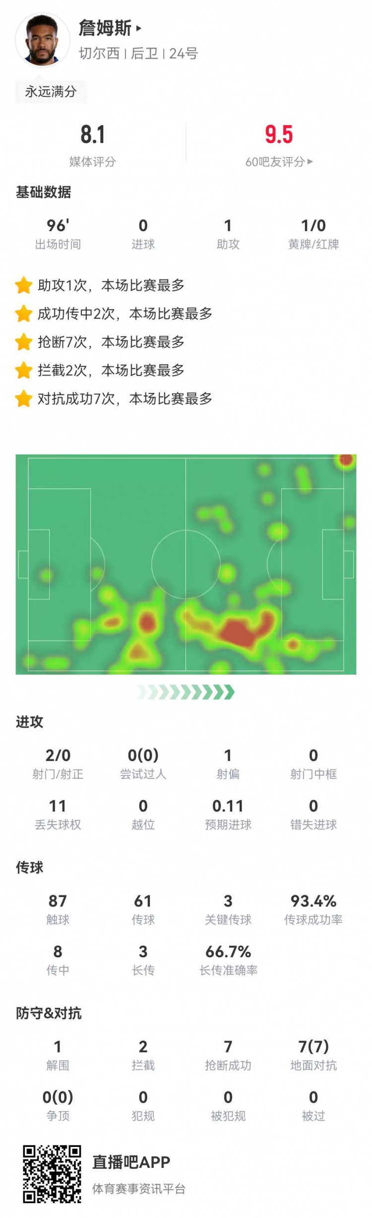 詹姆斯本场2射0正+1助攻 3关键传球+8传中 7抢断+7对抗7成功