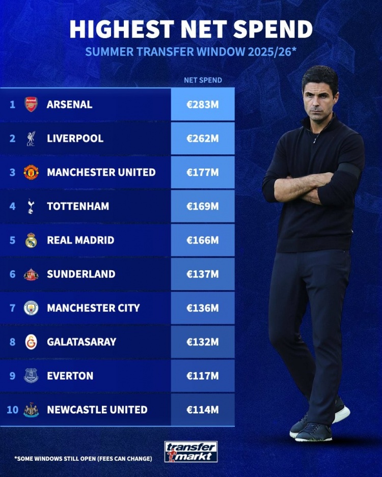夏窗净支出榜:阿森纳领衔英超8队无切尔西,皇马&加拉塔萨雷在列