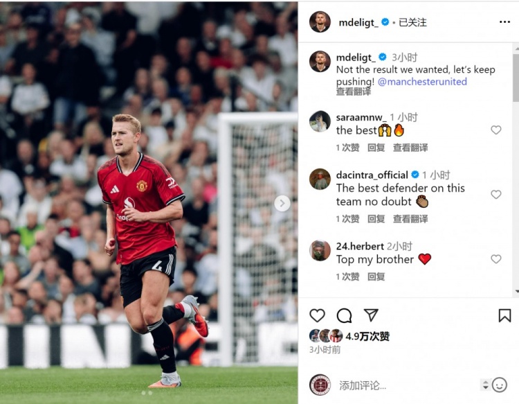 德里赫特社媒谈战平富勒姆:不是我们想要的结果,让我们继续努力